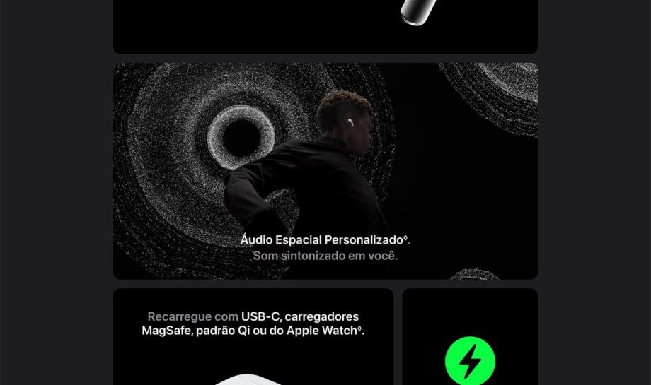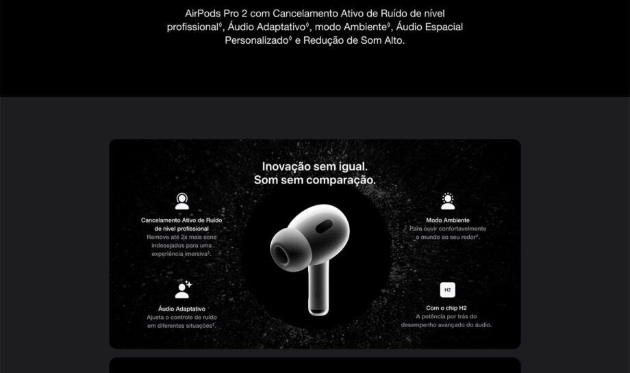 O Apple AirPods Pro (2a geração) apresenta um áudio tridimensional superior, graças ao chip H2. Este chip é a força por trás de recursos incríveis, como o cancelamento de ruído mais inteligente e a duração prolongada da bateria.