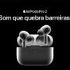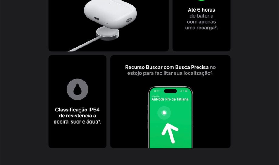 A bateria dos AirPods Pro oferece várias horas de uso contínuo, com uma duração prolongada graças ao chip H2.